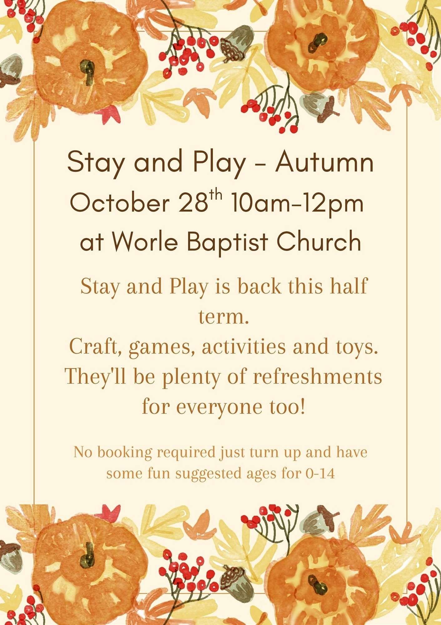 Stay and Play is back with an Autumn theme. Games, crafts and time for play, with plenty of different refreshments available for all!